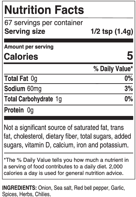 INGRÉDIENTS : Oignon, sel marin, poivron rouge, ail, épices, fines herbes, piments.